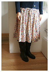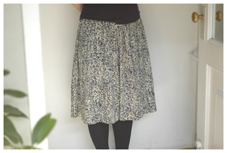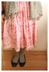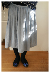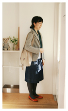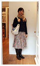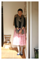 ![]() ![]() リバティプリントSnugで作ったゴムスカート (長方形の布を2枚合わせてゴムを通しただけの簡単なスカートです) お気に入りのスカートとネイビーのカットソー、黒のパンプスでシンプルにまとめました。すっかり秋らしくなってきたので、最近はタイツなど暖かアイテムを加えたコーディネートを楽しんでいます。今日は少しアクセサリーがあっても良かったかな?と思いました。秋の夜長、手編みの毛糸のブローチなど作ってみたいと思います。 |