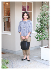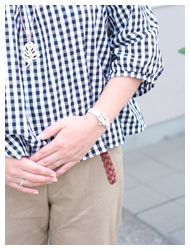 ![]() ![]() ![]() &FLOWERギンガムチェックで、伊藤まさこさんデザインの「パターン115」をブラウス丈にアレンジしました。ヨーク切り替え部分にパイピングコードはさんでみました。 &FLOWERギンガムチェックは程良い張りがあって、きちんとした感じに仕上がるのでお気に入りの生地です。撮影の日は夏日に近い陽気ということだったので、一枚でチノパンと素足にバレエシューズを合せました。小物もモノトーンに統一しました。 |