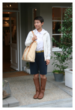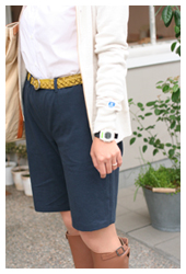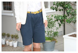 ![]() ![]() ナチュラルコットンチノクロスのネイビーで、『CHECK&STRIPE みんなのてづくり』(集英社)に載っているハーフパンツをつくりました。 ハーフパンツのウエストにベルト通しをつけ、少しアレンジしてみました。普段からカジュアルな感じの小物や服を身につけることが多いので、ハーフパンツもコーディネートしやすい一枚になりました。 |